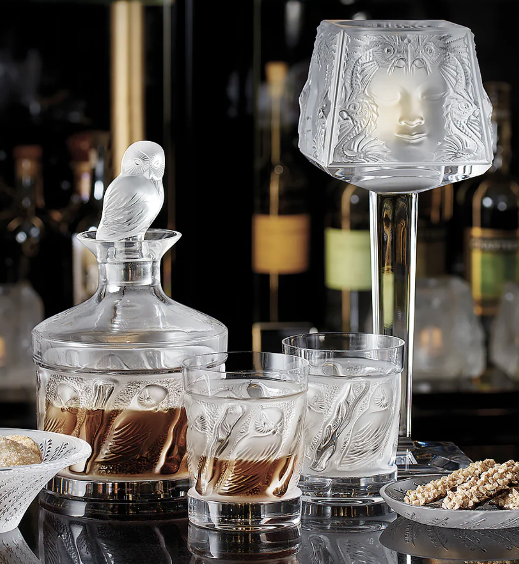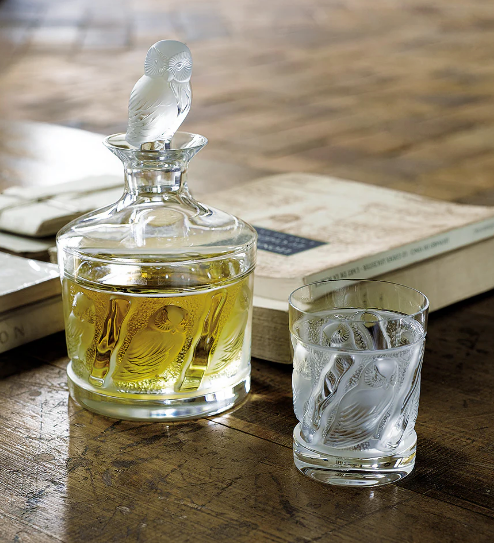 Lalique's Owl collection features exquisitely crafted crystal tumblers and a decanter with a distinctive owl stopper. Originally designed in 1994 and 1995, these pieces embody the brand's legacy of combining artistry and functionality. They are perfect for collectors and connoisseurs of fine crystal and drinkware.