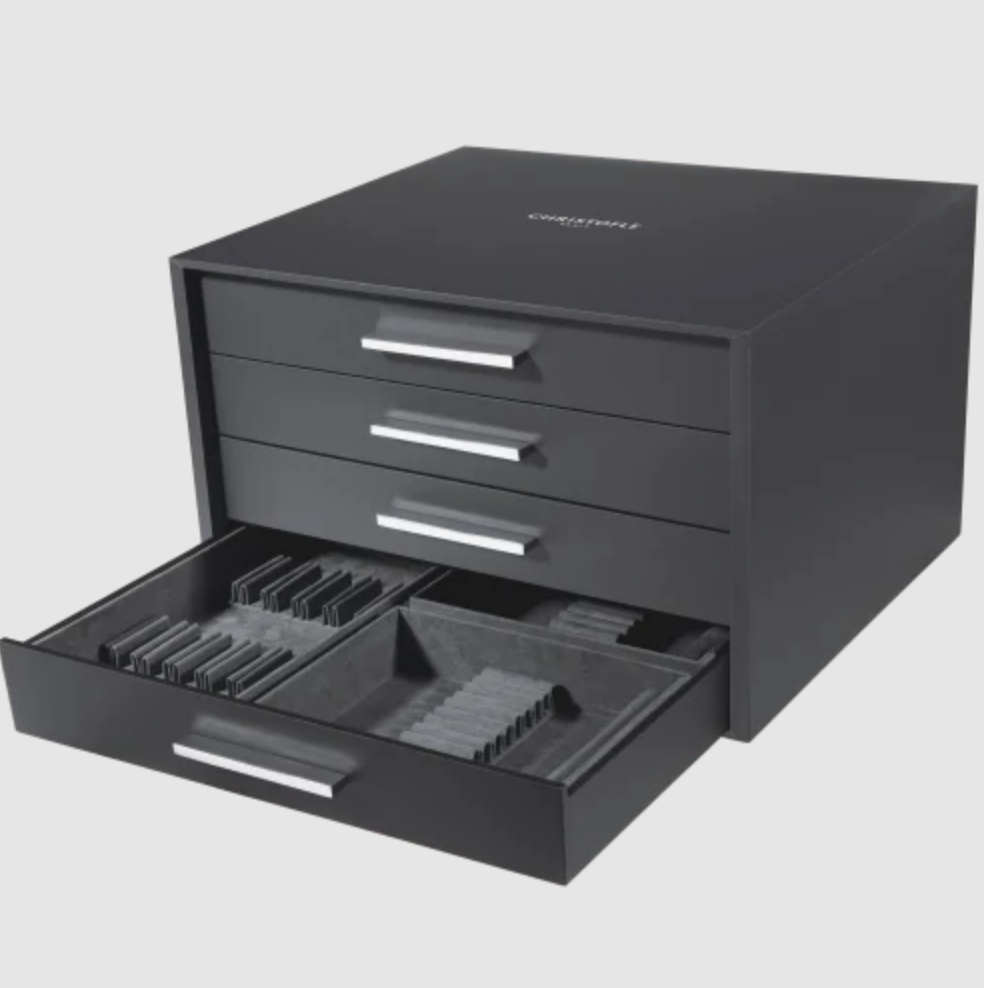 Christofle Cluny 24-Piece Silver-Plated Flatware set consists of the dining essentials for 6 guests including: 6 Tablespoons, 6 Dinner Forks, 6 Dinner Knives, 6 After Dinner Tea Spoons. This set also comes with a storage box. The interior is made of an anti-tarnish cloth that helps minimize oxidation.