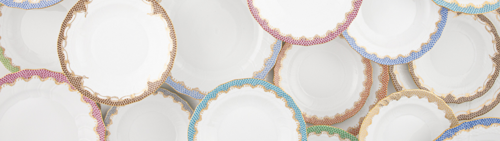 The Herend Fish Scale Dinnerware Collection brings bold colors combined with its iconic fish scale decorative borders to your table. Originally designed to complement other classic Herend patterns, the distinctive fish scale motif truly shines when it is featured as the centerpiece of a luxury dinnerware set. This dinnerware collection is available in an array of colors, including Black, Blue, Brown, Green, Gold, Gray, Jade, Light Blue, Raspberry, Rust, and Turquoise. Its versatility and striking design make it an essential addition to any Herend porcelain assortment.