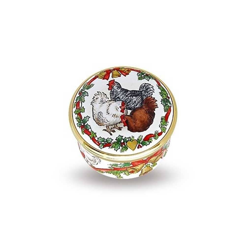 Experience the luxurious tradition of the "12 Days of Christmas" with Halcyon Days' Three French Hens enamel box adorned with hand-painted holly, red ribbon, and festive bells. This exclusive keepsake makes a perfect Christmas present, adding elegant charm to any holiday celebration.