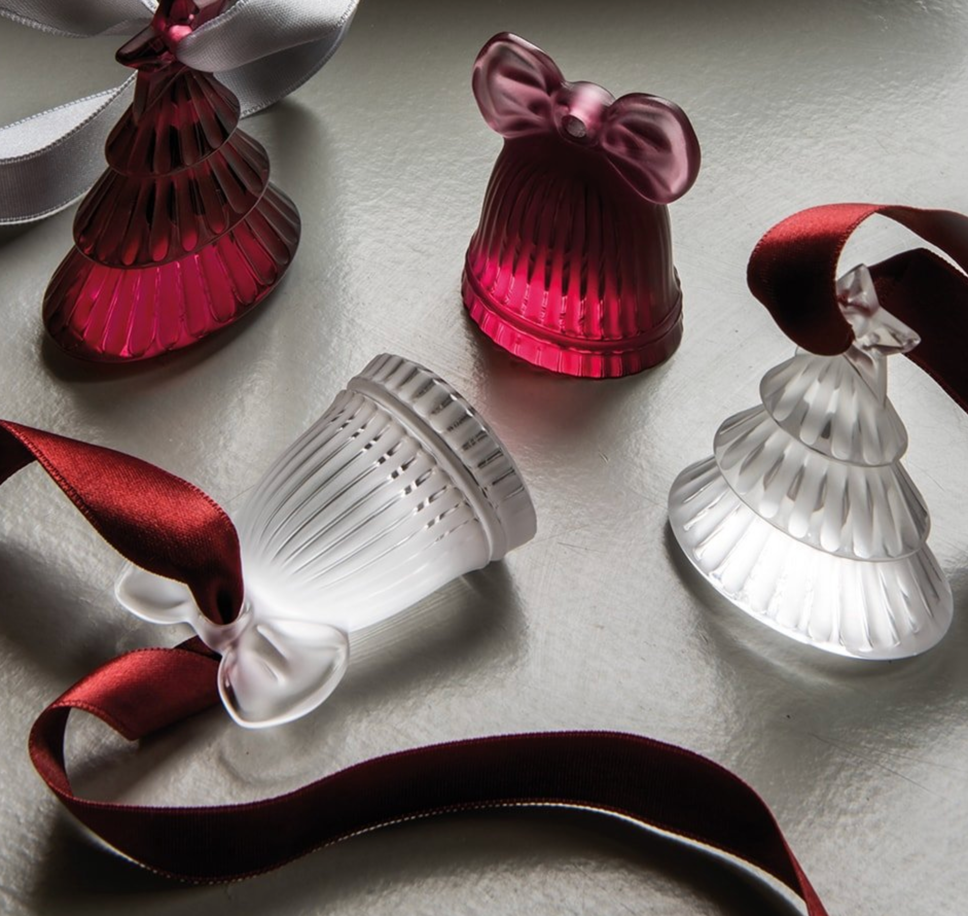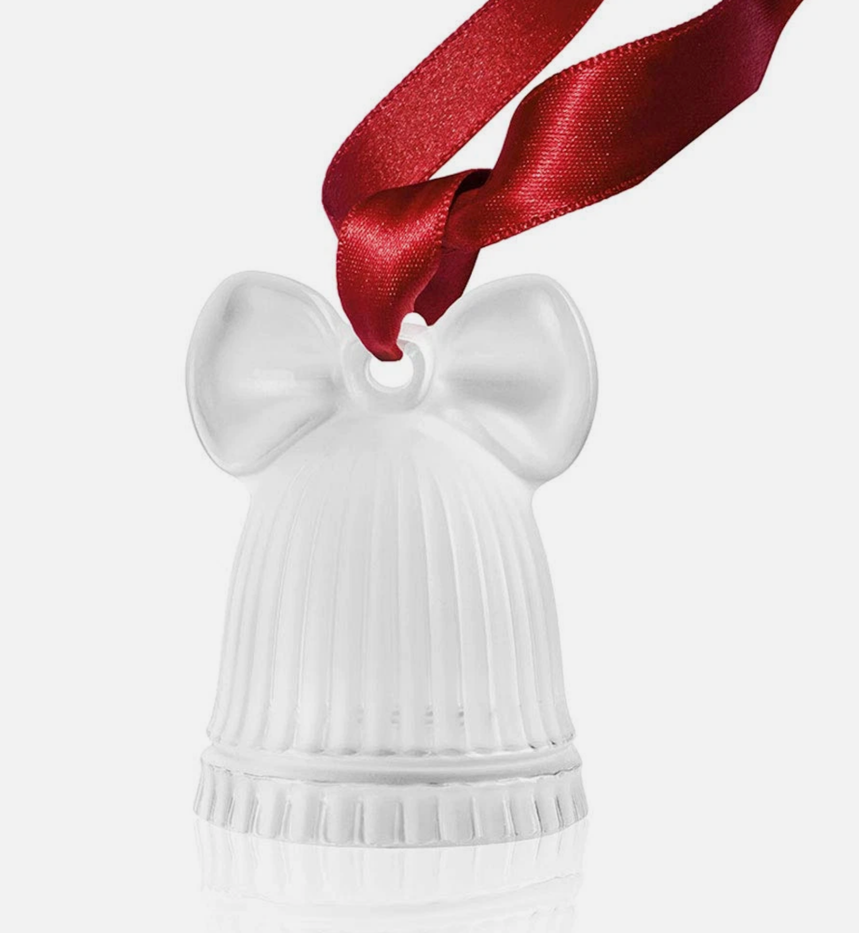 Lalique Christmas Bell Decoration, made to hang on the tree or stand on a table, comes in clear frosted and red frosted colors. The scintillating reflections will beautifully adorn any home. This is a classic yet original gift from Lalique.
