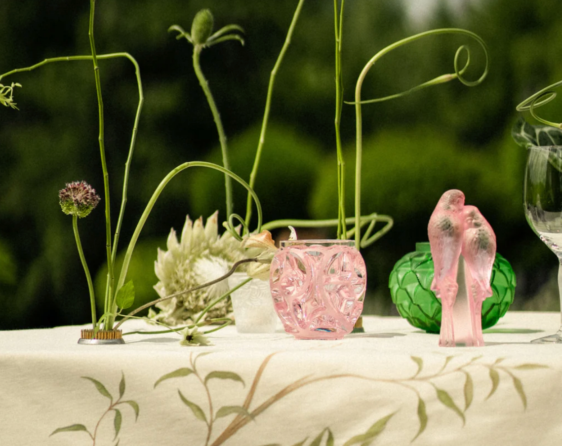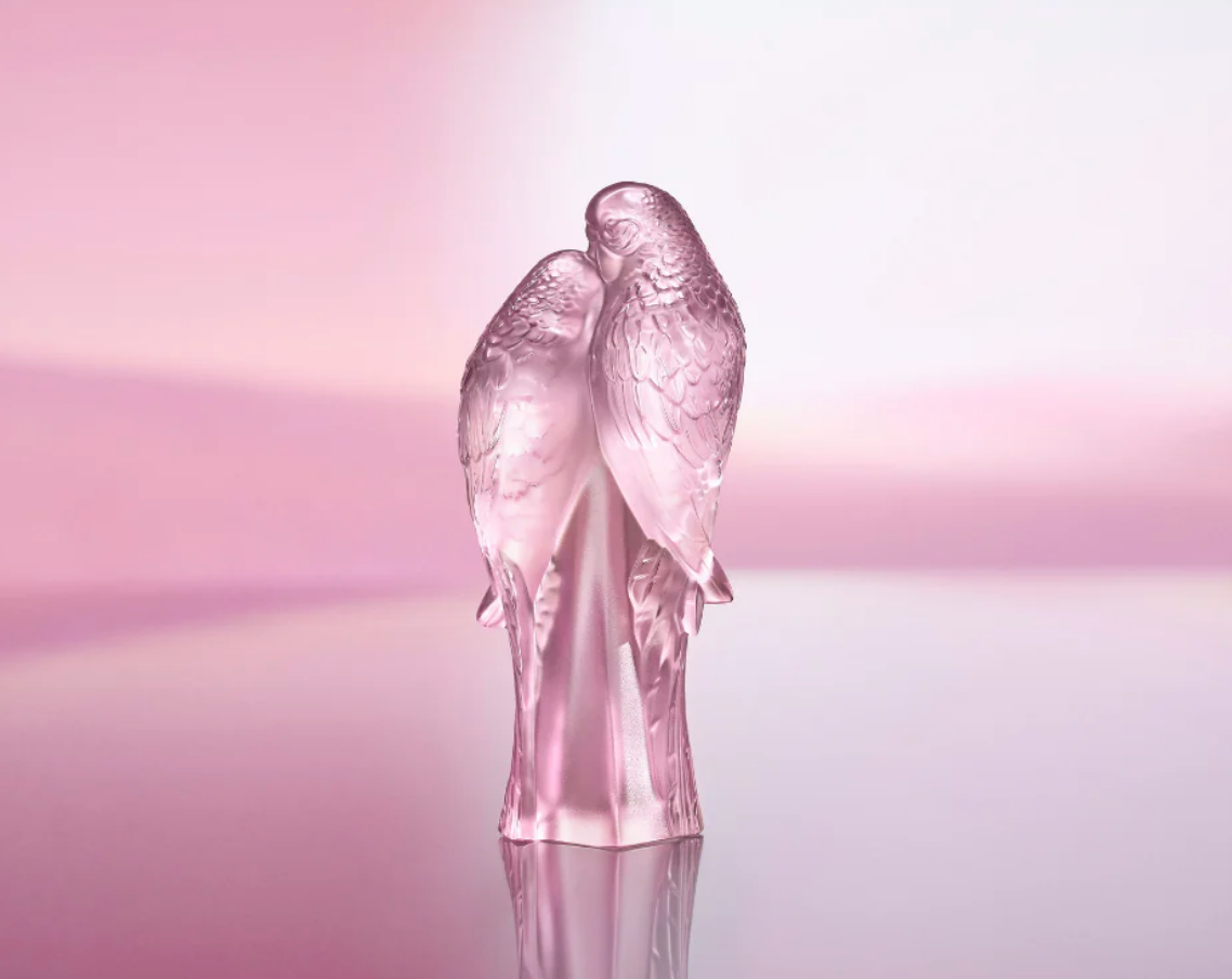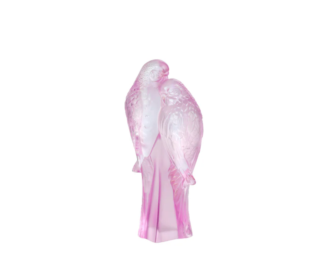 The Lalique Two Parakeets Sculpture showcases a tender pair of lovebirds in radiant clear or pink luster crystal, their finely detailed plumage symbolizing eternal love and a deeply connected, harmonious relationship. A perfect piece for collectors and romantic gifting.