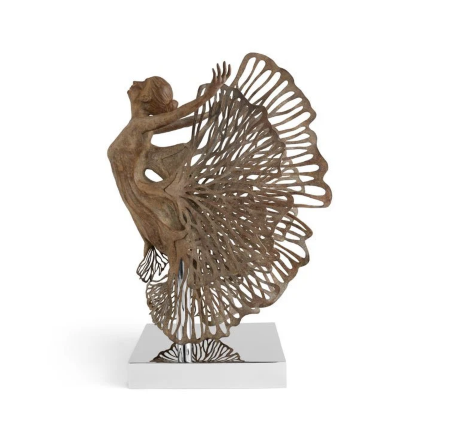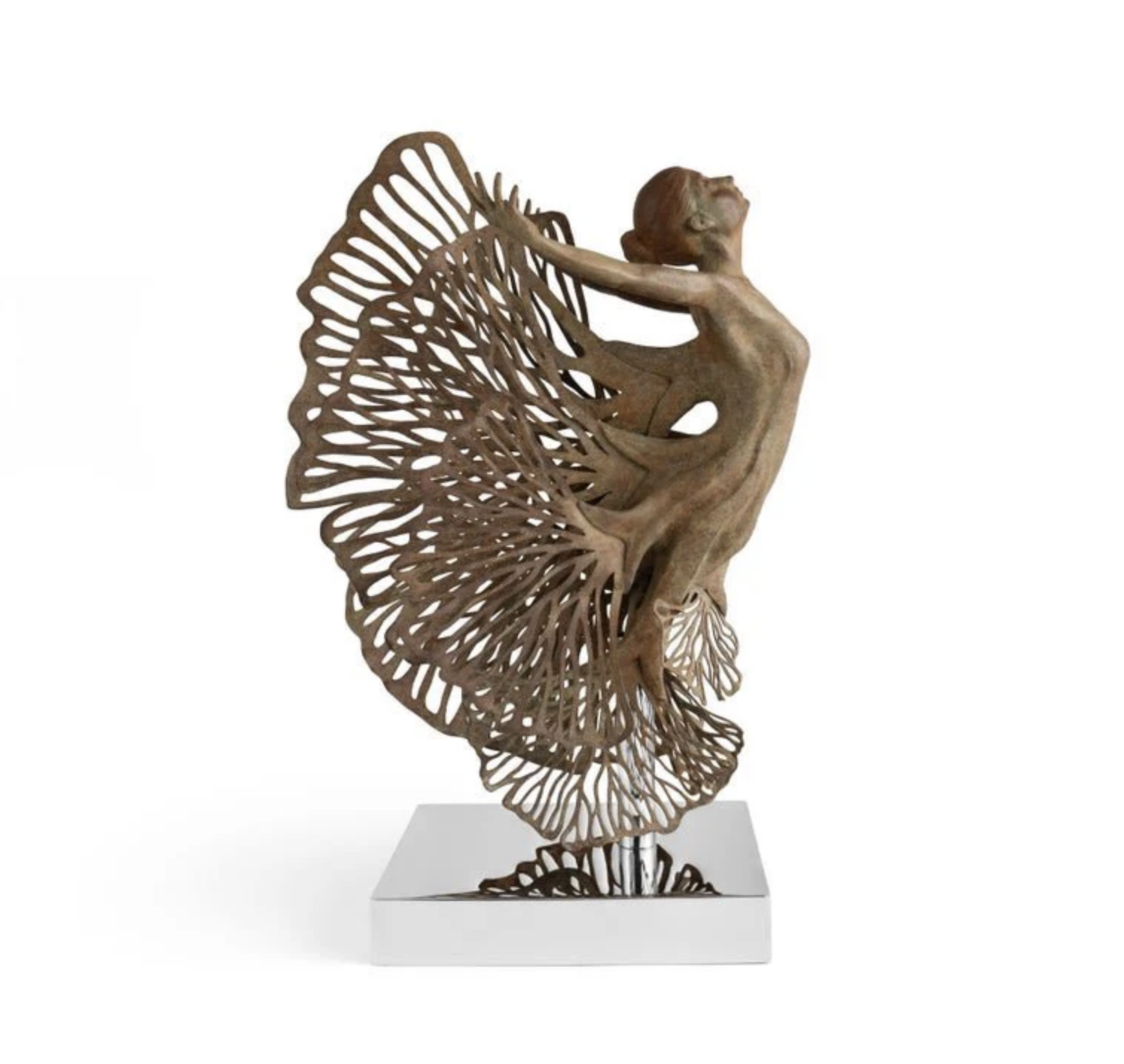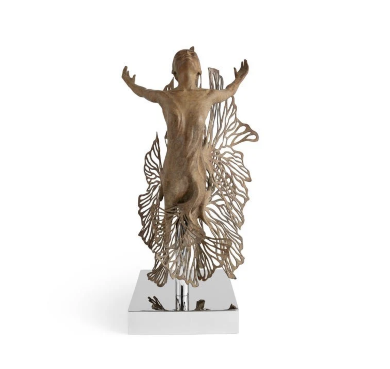 The Ginkgo Fairy Sculpture captures the ethereal beauty of transformation and nature. Sculpted in painted brass and stainless steel, each piece is a one-of-a-kind expression of joy and harmony, with fluttering ginkgo leaves and an elegant figure poised in flight. Available in two sizes: Tabletop and Larger Limited Edition.