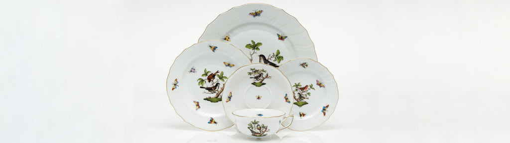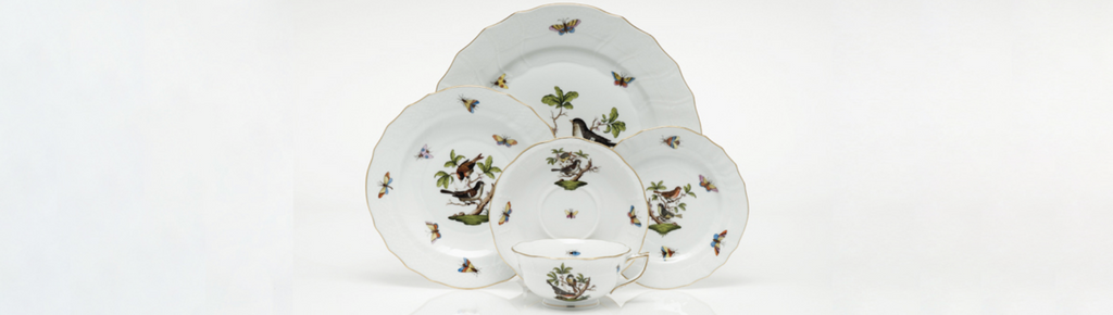 The Herend Rothschild Bird Collection is a masterpiece of hand-painted porcelain, first created in 1860 for the prestigious Rothschild family of Europe. Celebrated by collectors for its exquisite artistry, this iconic Herend dinnerware features twelve unique motifs depicting a charming 19th-century tale of Baroness Rothschild’s lost pearl necklace and playful birds. The pieces with the added fish-scale design are accented with a bold, colorful border, available in Blue, Green, or Brown, adding depth to this vibrant fine porcelain collection.