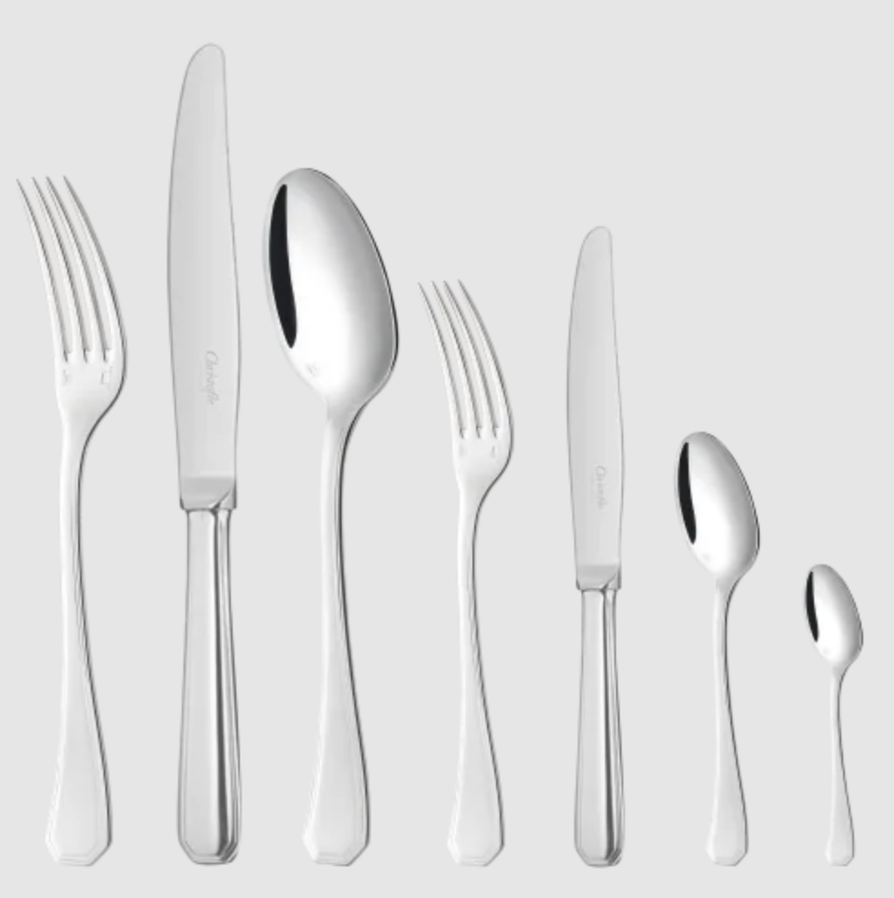 Christofle America 48-piece silver-plated flatware set serves 12 guests and includes: 12 tablespoons, 12 dinner forks, 12 dinner knives, 12 coffee spoons. This set also comes with a storage box.