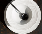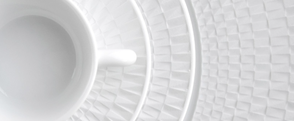 The delicate design of the Twist collection combines various influences: the light effects of the rice paper Japanese screens, the art of origami folding, the braiding and caning of the furniture of the 50s, not to mention the 3D graphics offered by the new technologies. The result is an unprecedented subtle effect of a rigorously geometric pattern in twisted momentum. Engraved on the rim of the plates and on the outside of the various pieces of the collection is the light that reveals the alternation of matt and shining rendering, giving a vibrant radiance that enlivens the whiteness of porcelain.