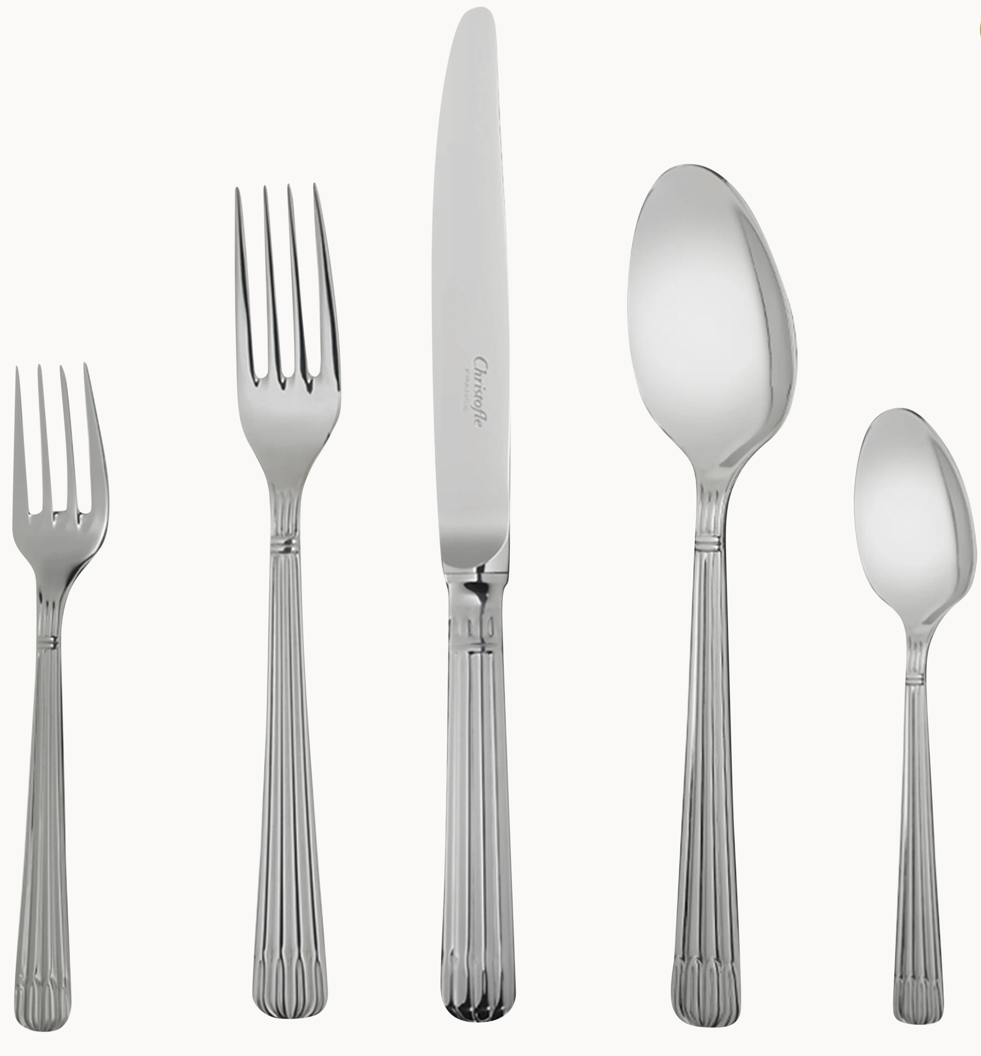 The Christofle Osiris 5-piece stainless steel flatware set contains the dining essentials for one person: a tablespoon, a dinner fork, a dinner knife, a dessert fork, and an after-dinner teaspoon.