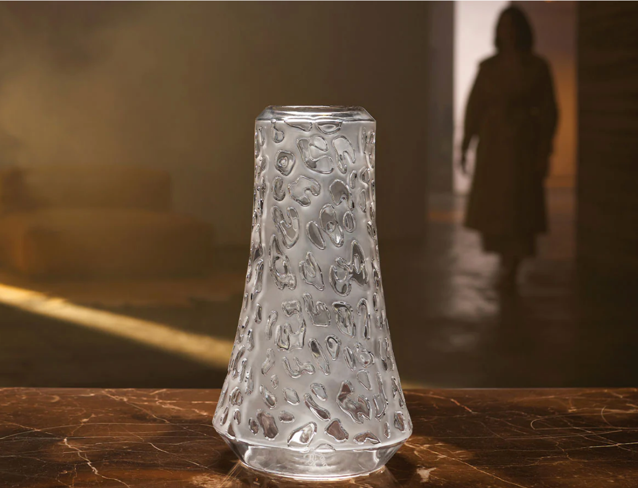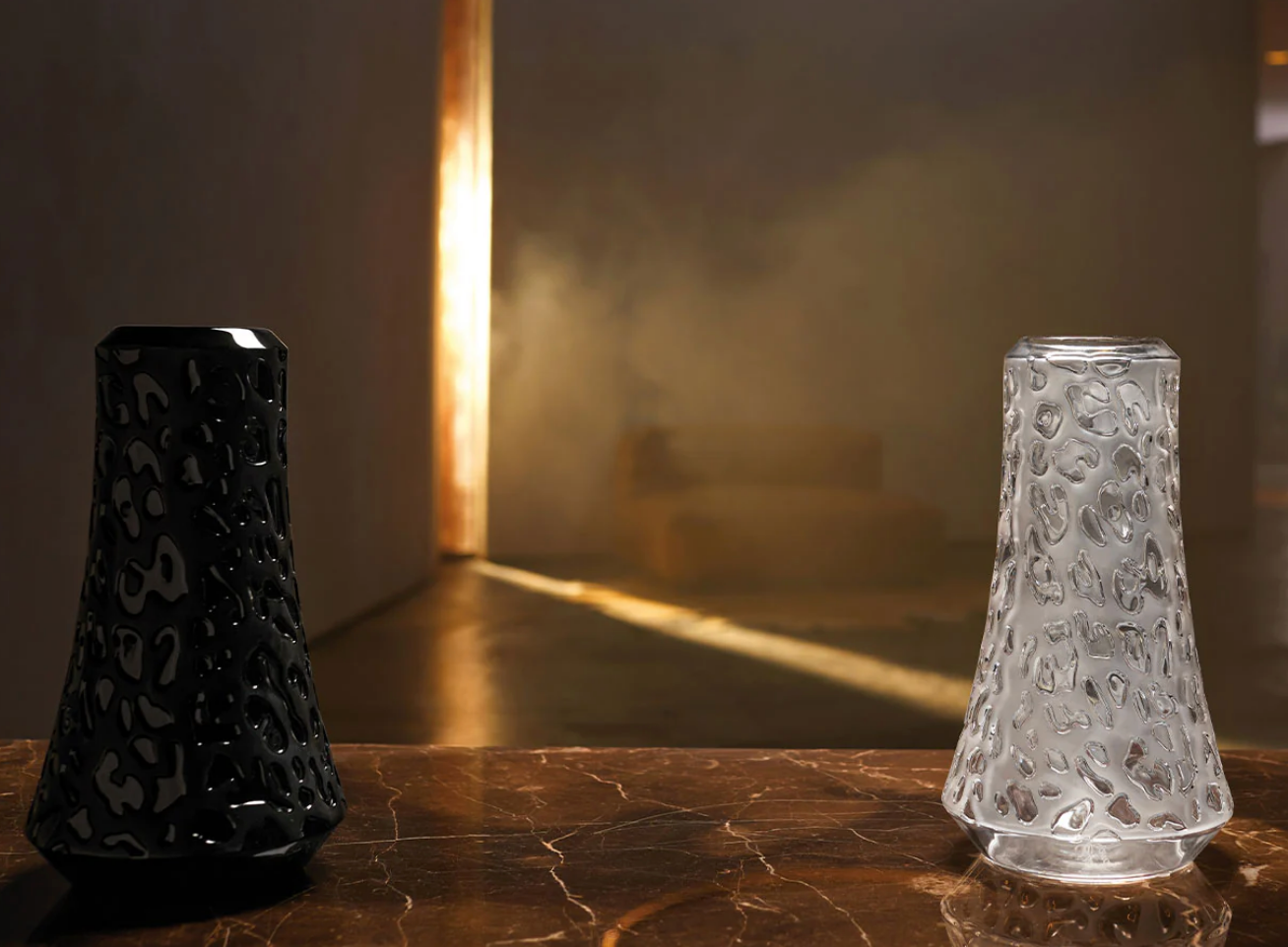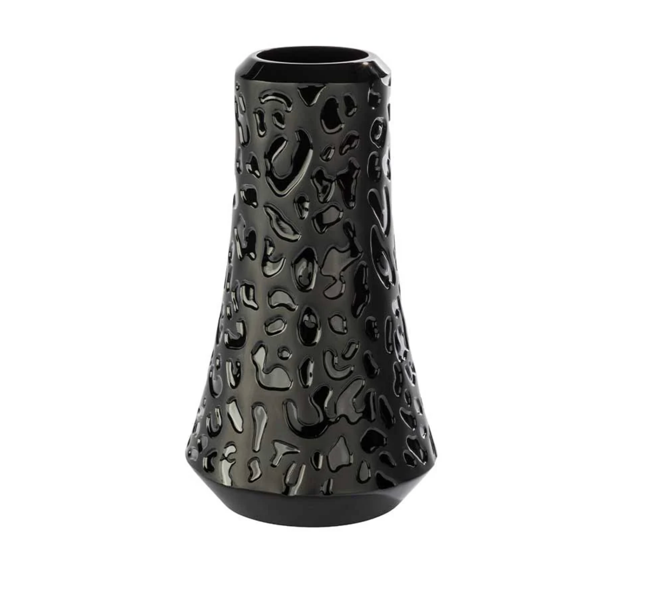 These elegant vases feature black and white patterns resembling panthers dancing in a captivating display of light and shadow. The design beautifully renders their silhouettes and velvety textures.