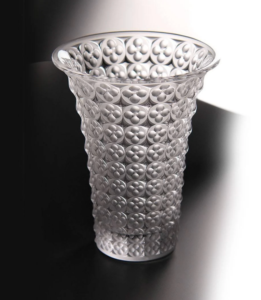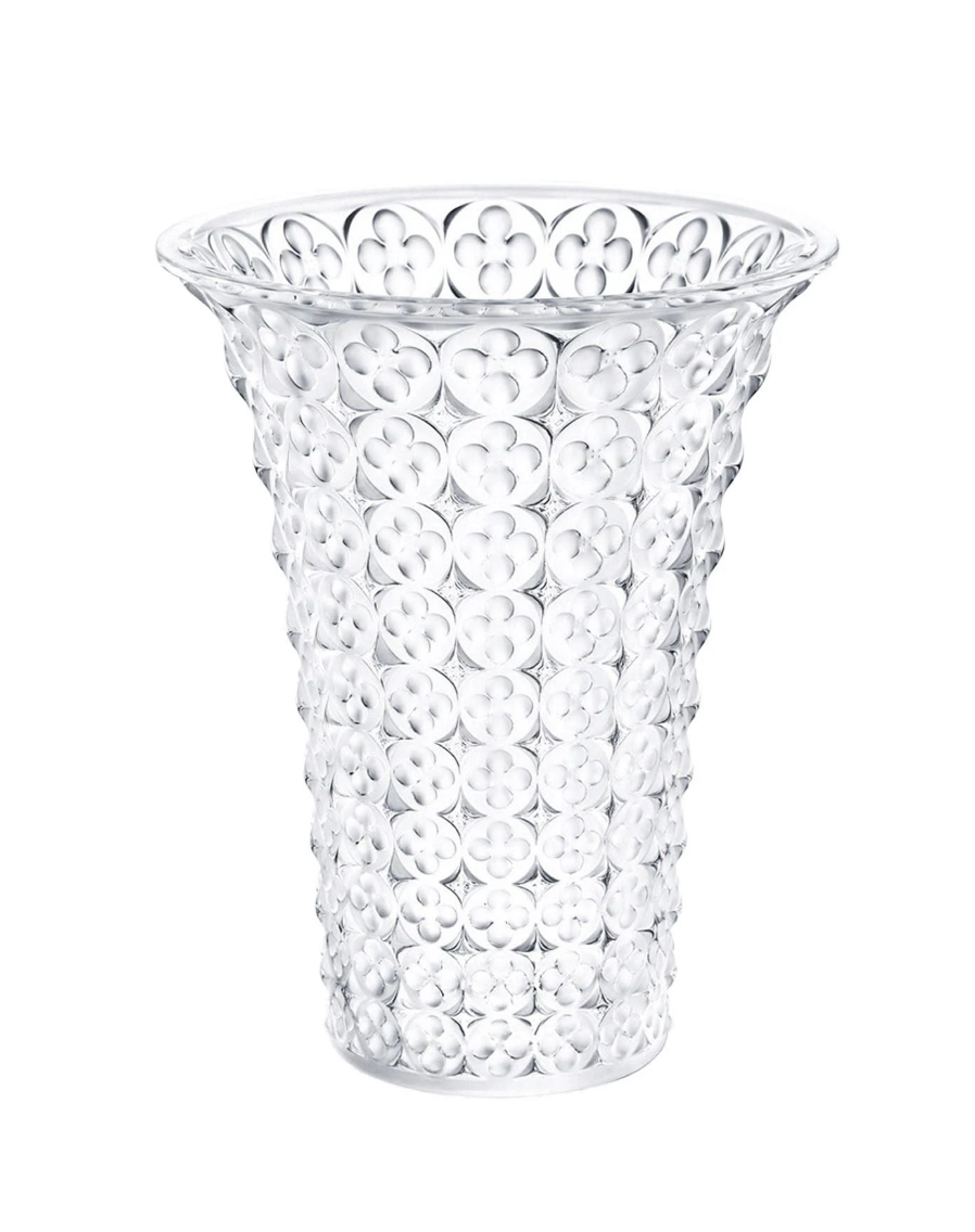 The Lalique Venezia vase is a beautiful example of French craftsmanship. It features a repeating clover pattern inspired by classic Venetian architecture. Handcrafted from the finest crystal, it stands 6 7/8 inches and symbolizes luck, hope, faith, and love.