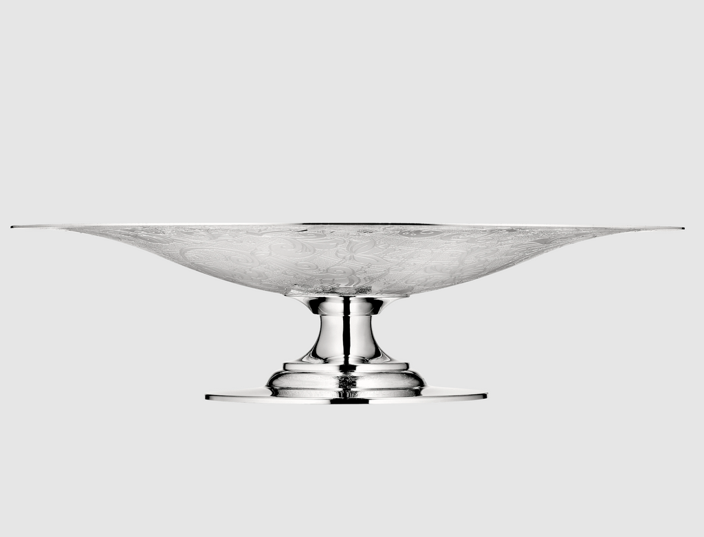 The Christofle Jardin D'Eden Silver-Plated Fruit Bowl with Pedestal Base is a serving bowl characterized by its low-profile design and sturdy pedestal base, making it an ideal centerpiece or elegant fruit bowl.