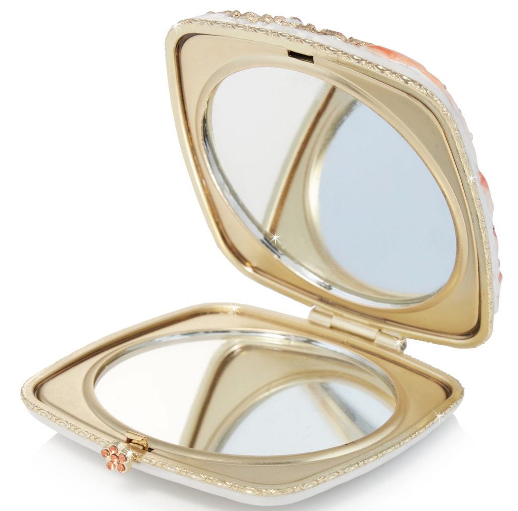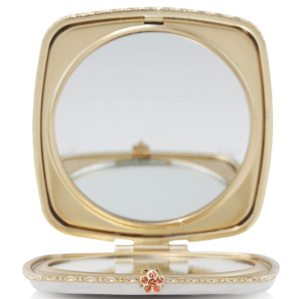 Materials: Zinc design upon a brass compact with a 14K gold finish, hand-enameled and hand-set with European crystals. Two interior mirrors – regular and magnified 2x.