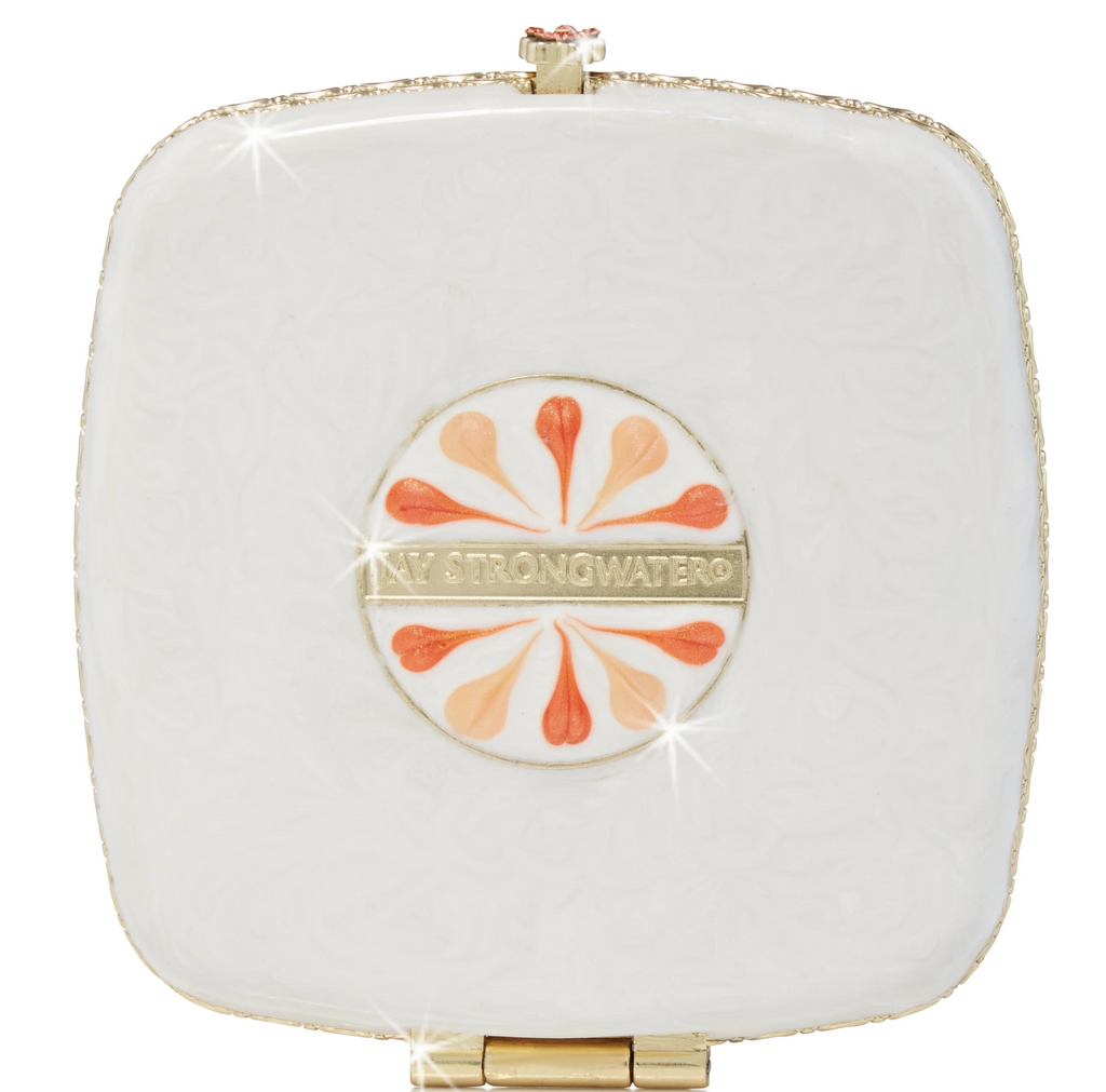 The Jay Strongwater Lily Floral Flamingo Compact is a stunning fusion of craftsmanship and elegance. Expertly hand-enameled on zinc over a brass base with a 14K gold finish, it showcases a vibrant flamingo set among blooming flowers, delicately accented with hand-set European crystals. Measuring 3" square, this compact features dual interior mirrors—a standard and a 2x magnified—to enhance precision on the go. Packaged in a signature Jay Strongwater box with a bronze pouch, it offers both luxury and practical charm for your daily routine.