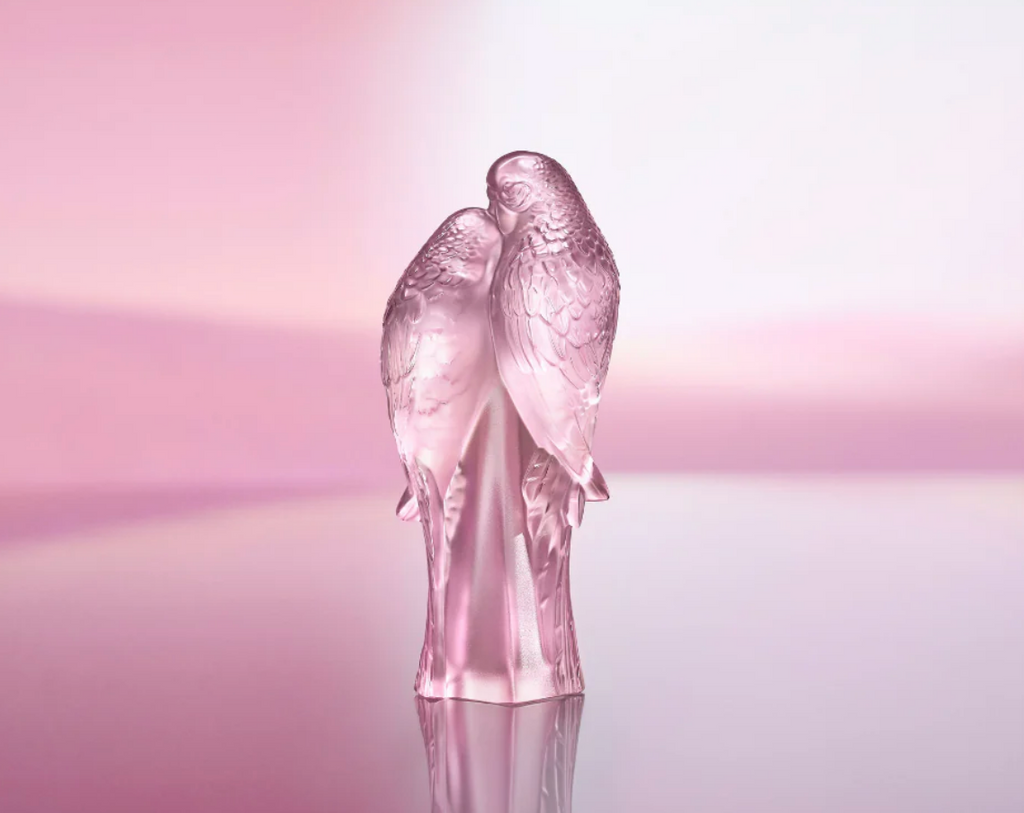 The Lalique Two Parakeets Sculpture showcases a tender pair of lovebirds in radiant clear or pink luster crystal, their finely detailed plumage symbolizing eternal love and a deeply connected, harmonious relationship. A perfect piece for collectors and romantic gifting.